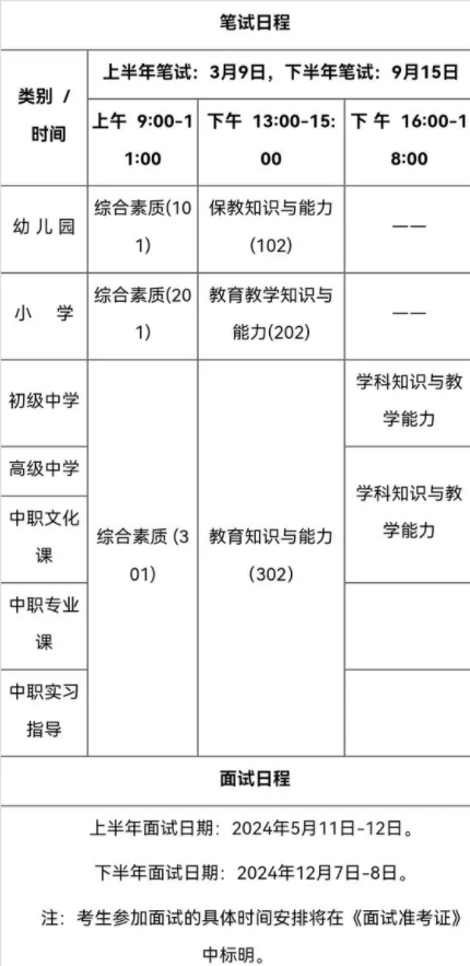 2024年教师资格证笔试、面试考试日程安排已出,2024年上半年教师资格证笔试时间:3月9日,面试时间:5月11日-12日。2024年下半年教师资格证笔试时间:9月15日,面试时间:12月7日-8日。