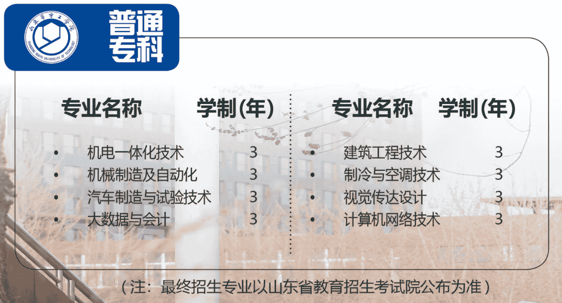 山东华宇工学院有专科专业,例如机电一体化技术、机械制造及自动化、汽车制造与试验技术、大数据与会计、建筑工程技术、制冷与空调技术、视觉传达设计、计算机网络技术等专业。以下是具体名单一览表,希望对大家有所帮助。