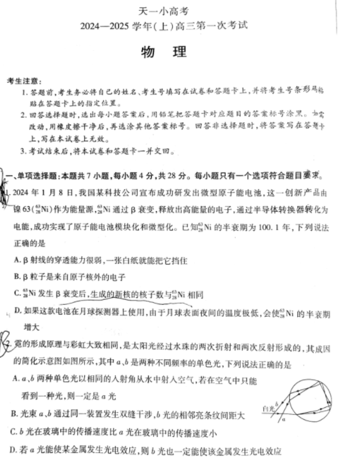 天一大联考2025届高三第一次考试物理试题及答案解析