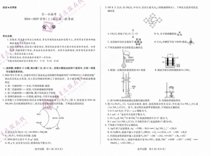 天一大联考2025届高三第一次考试化学试题及答案解析