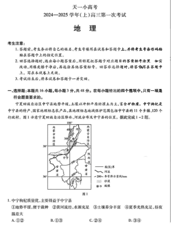 天一大联考2025届高三第一次考试地理试题及答案解析