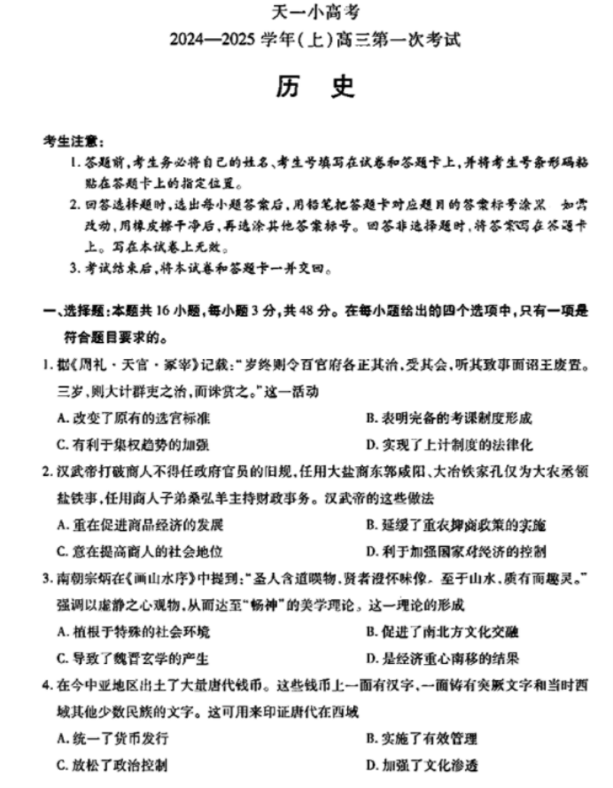 天一大联考2025届高三第一次考试历史试题及答案解析
