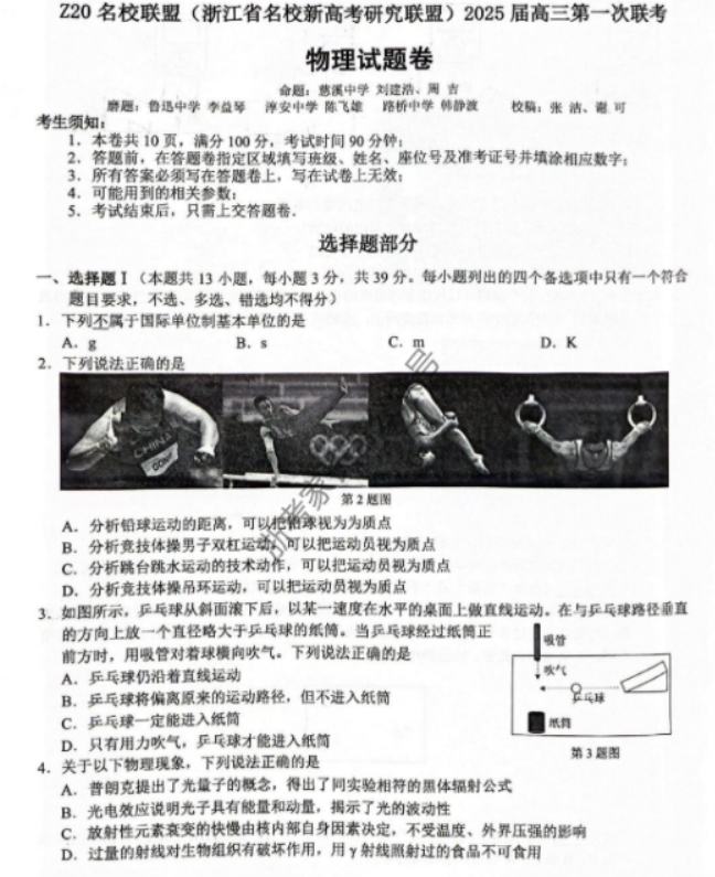 2025届浙江Z20名校联盟高三开学考物理试题及答案解析