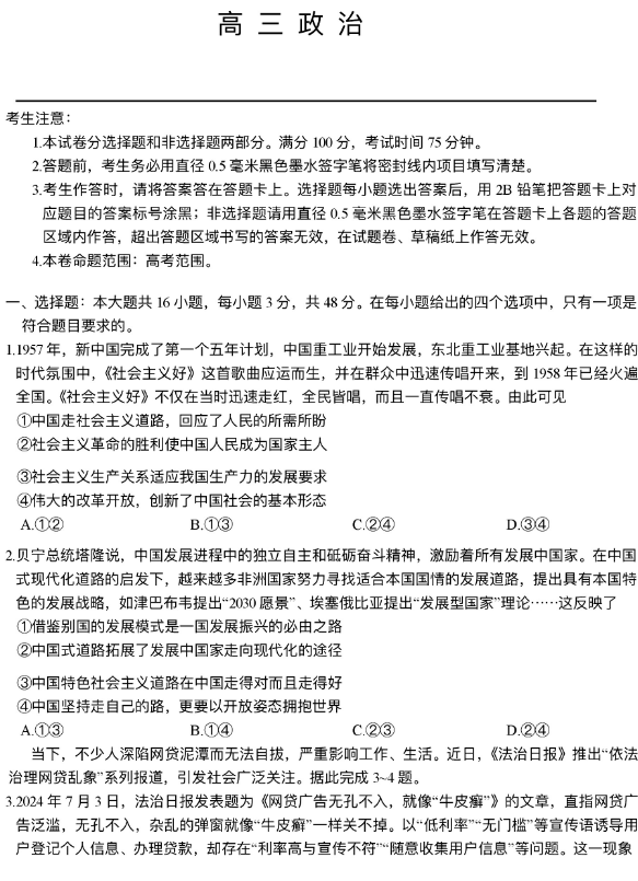 2025届九师联盟高三8月开学考政治试题及答案解析